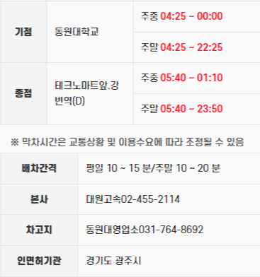 경기도 광주 1번 버스(광주하남교육청<->전원마을입구) 기점 종점 노선 배차간격 차고지 전화번호 (0) | 2023.04.04 |