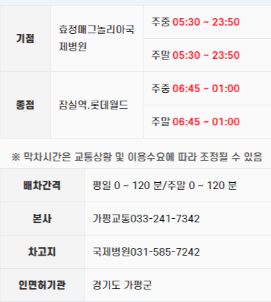 가평 버스 7001번(HJ매그놀리아국제병원) 운행시간표