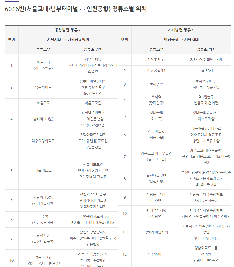 공항버스 6016번 시간표 운행노선도 요금 정류소위치 실시간위치조회