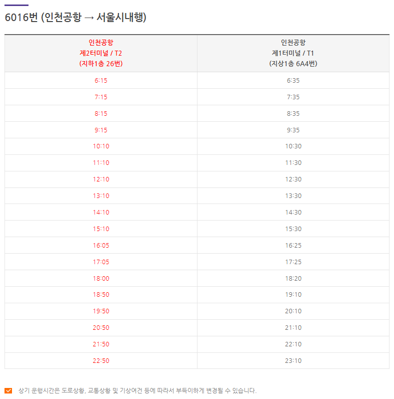 ◆ 공항버스 6016번 운행 시간표