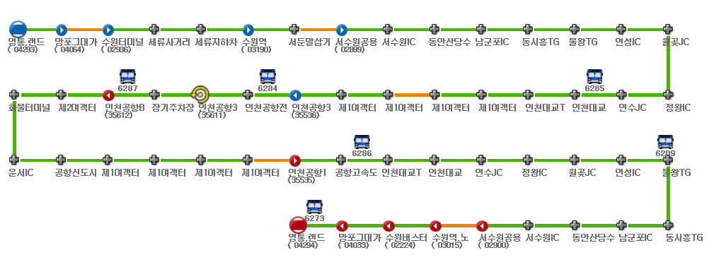 영통.랜드마크호텔 - (← 수원이비스호텔 ←)[1] - 망포역 - 수원버스터미널 - 수원역 - 서수원시외버스터미널 - 동안산당수IC - 수원광명고속도로 - 동시흥JC - 제3경인고속화도로 - 송도해안도로 - 인천대교 - 공항신도시JC - 인천국제공항고속도로 - 인천공항T1[T1] - 인천공항T2[T2]