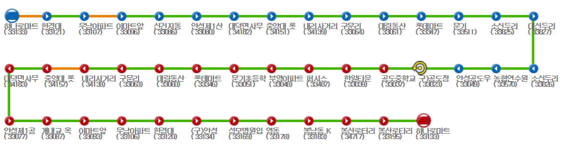 하나로마트 - (→/← 인지사거리 ← 시민회관.보건소 ← 봉산로터리. 안성시청 ← 구.터미널 ←) - 이마트앞 - 중앙대입구 - 대림동산 - (→ 대신두리/← 한일타운아파트 ←) - (구)공도정류장