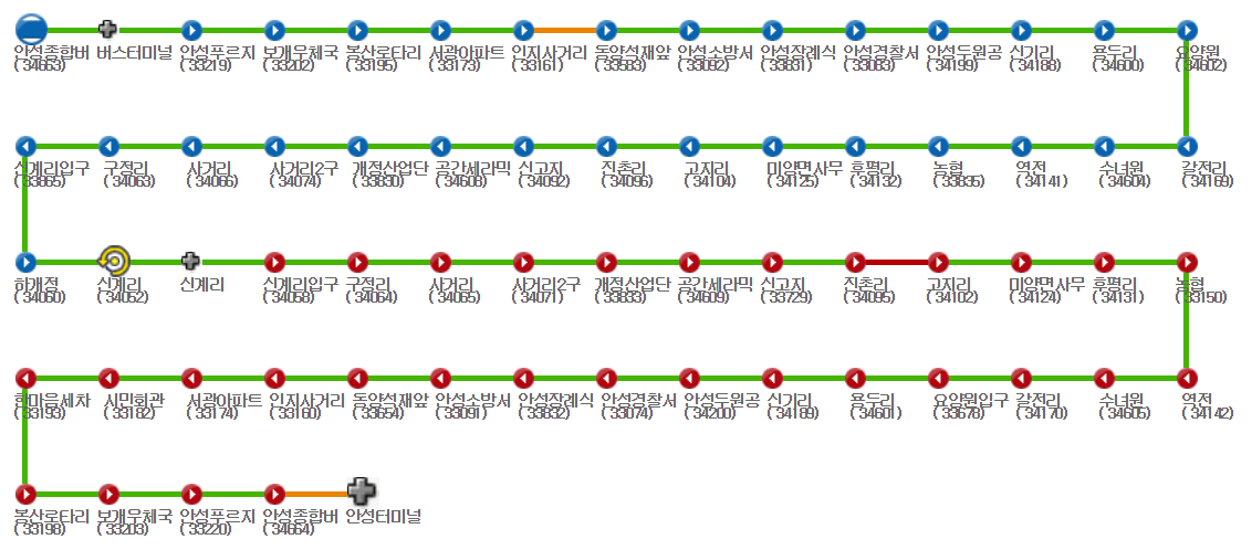 안성종합버스터미널 - 보개우체국 - 봉산로터리.안성시청 - 시민회관. 보건소 - 인지사거리 - 안성대교 - 안성소방서 - 안성경찰서 - 안성두원공고 - 신기리 - 용두리 - 갈전리 - 역전리 - 미양면사무소 - 고지리 - 진촌리 - 사거리 - 신계리입구 - 신계리 - 하개정