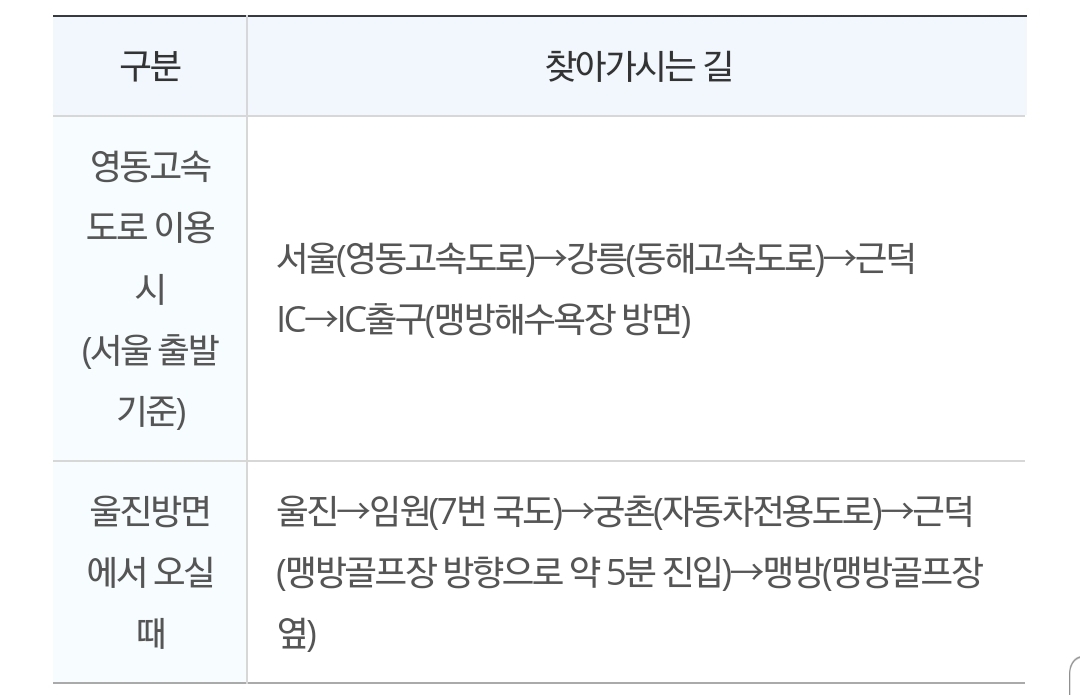 삼척종합터미널 → 상맹방리에서 하차 (20,21,22,23,24번 버스 이용, 20분 소요)