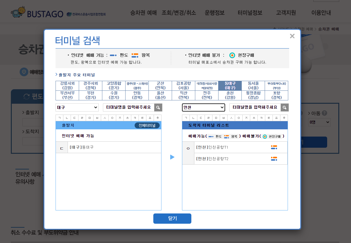 가까운 터미널을 선택한 후 도착지 터미널 지역선택에서 [인천]을 선택하면 인천공항 터미널이 뜬다