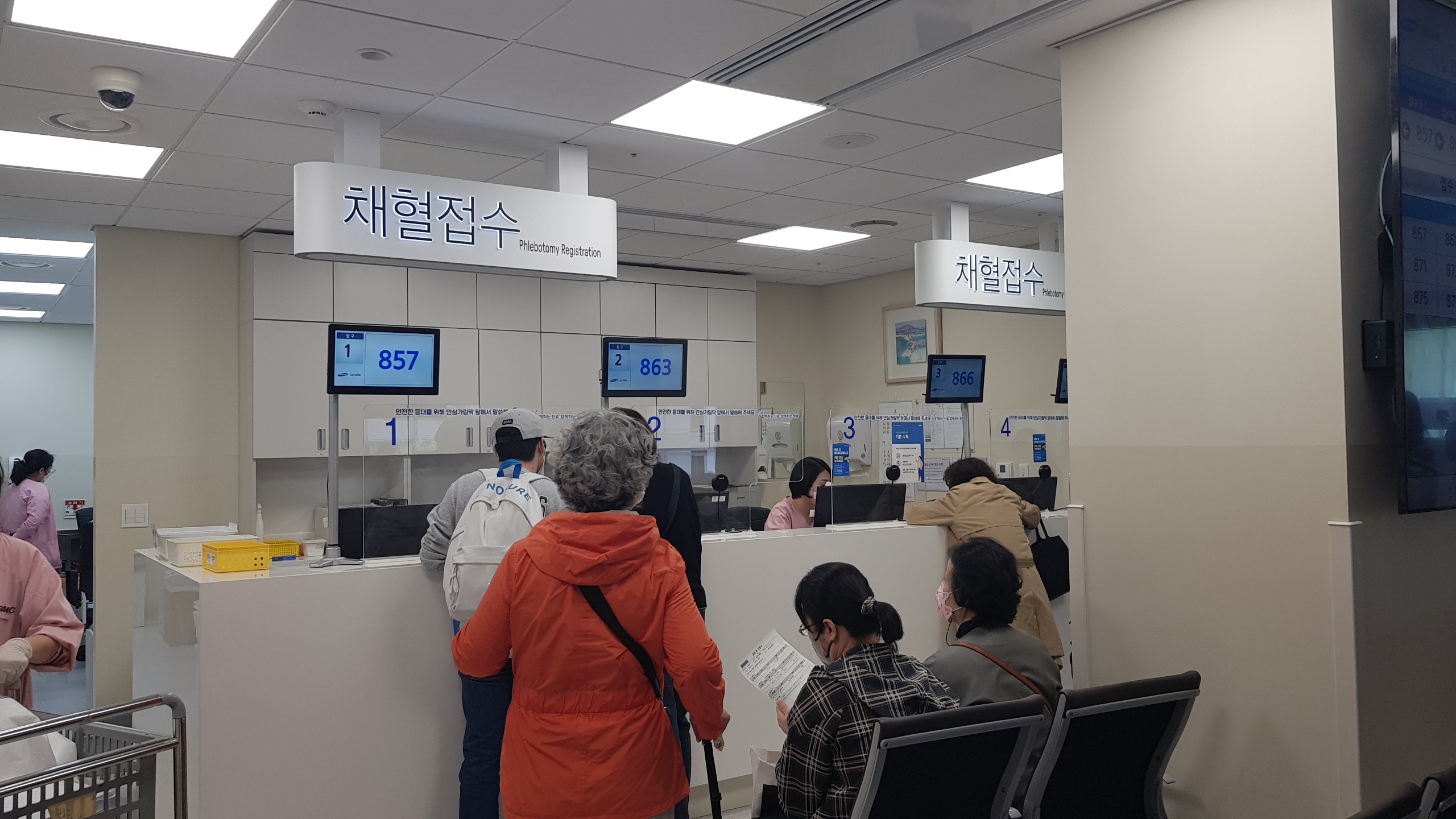 번호표를 꼭 챙겨 바로 오른쪽 옆에 있는 채혈접수 창고 앞에서 번호표의 번호를 부를 때까지 대기합니다