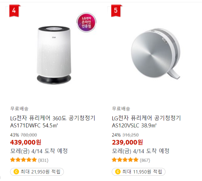최근 쿠팡에서 가장 많이 팔린 실내공기청정기