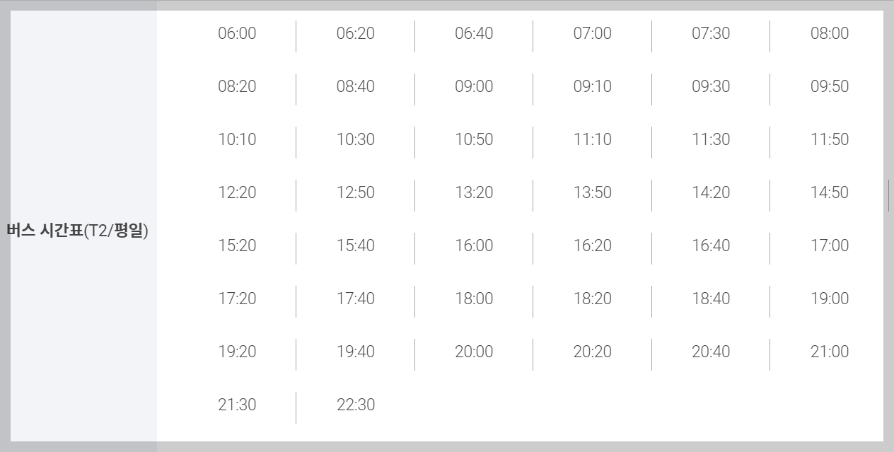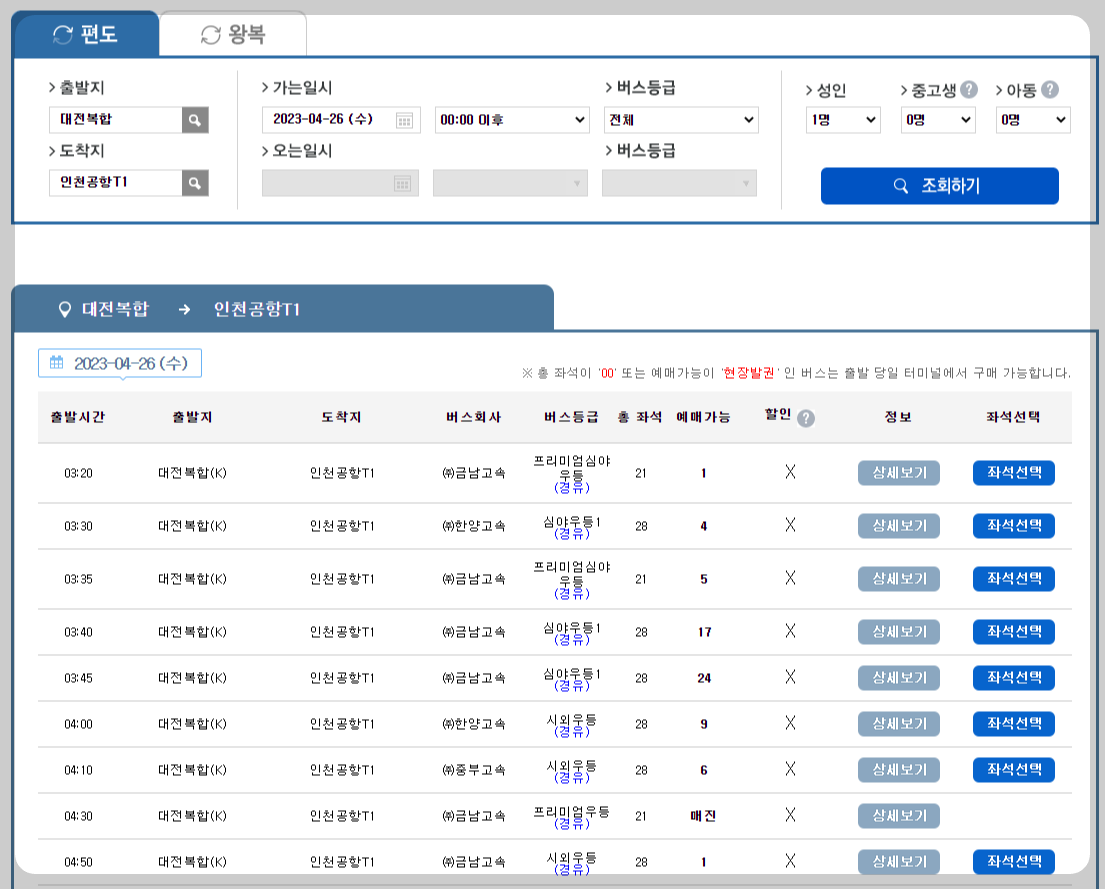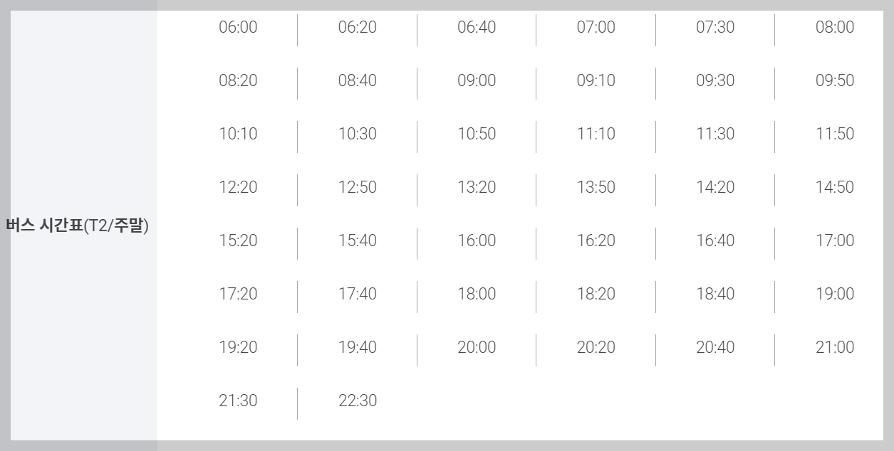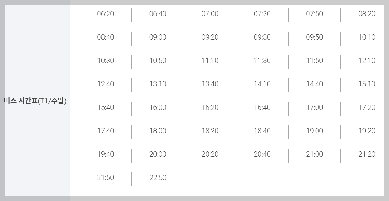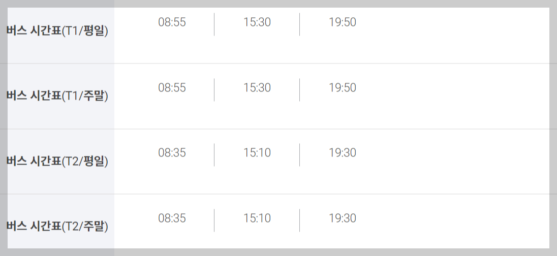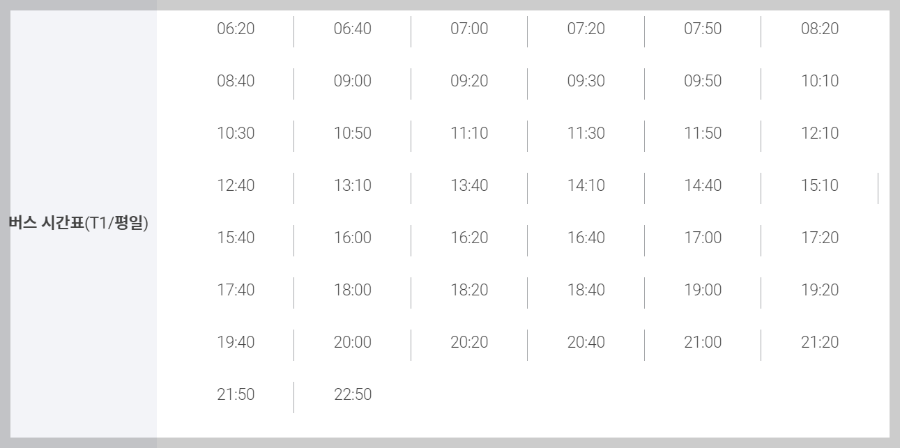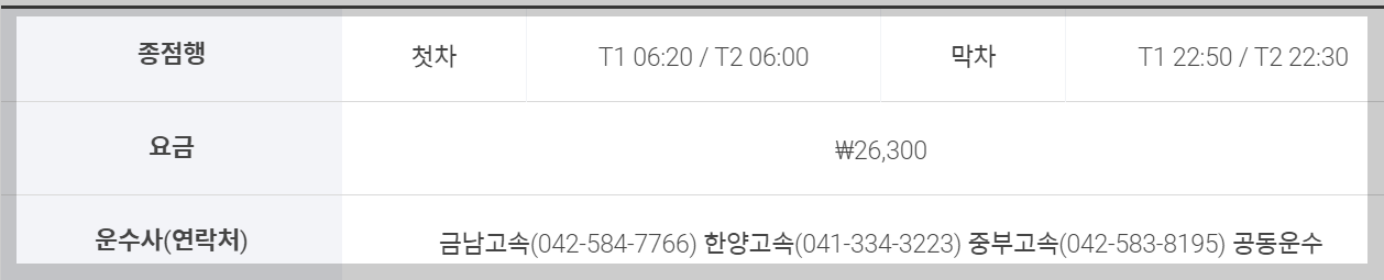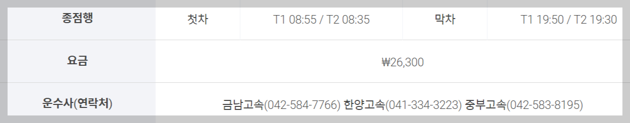 아래는 인천공항에서 대전복합, 대전서남부로 가는 버스 시간표입니다.