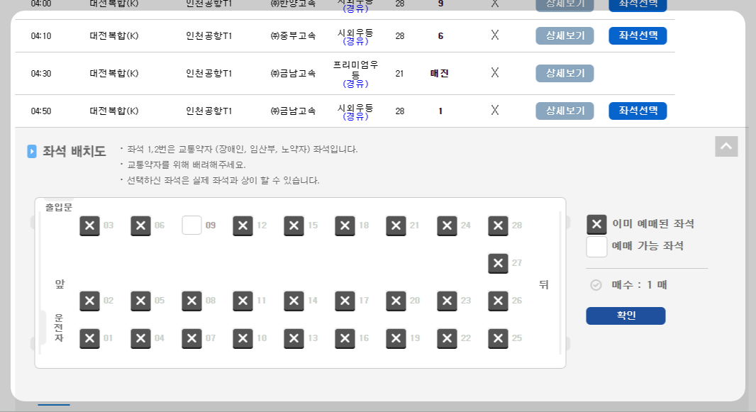 4. 선택하고 승차권예약을 누르면 배차 시간을 조회할 수 있다.