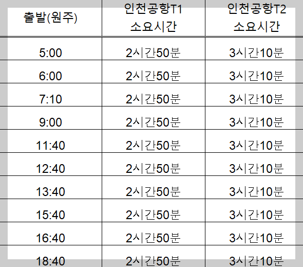 아래는 인천공항에서 원주로 가는 버스 시간표입니다.