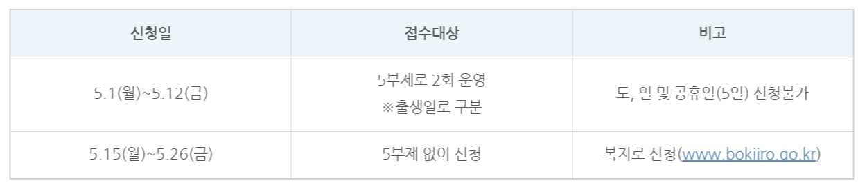 ※ 출생일 끝자리가 5, 0인 청년은 5월5일은 신청할 수 없으며, 5월4일, 12일 또는 3~4주차 신청가능
