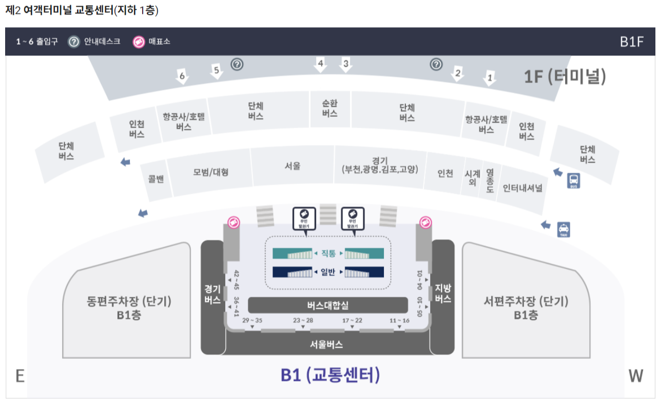 - 승차장 : 제2 여객터미널 3층 중앙 4번 출구, 5번 출구 사이