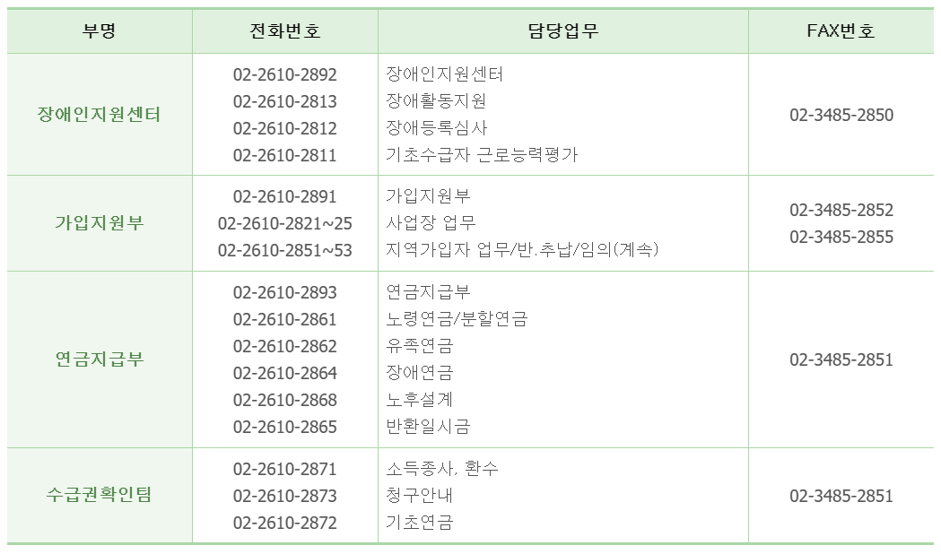 해당 지사의 담당 업무를 수행하는 부서의 연락처가