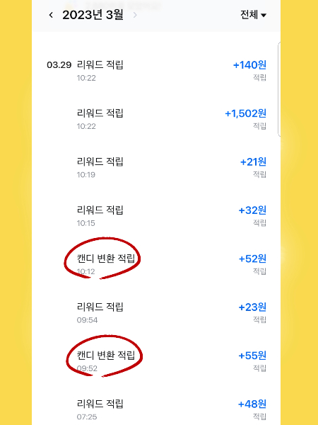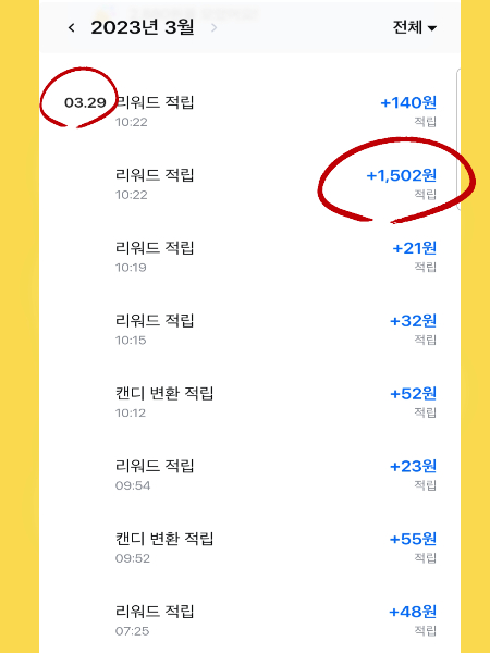 아래 사진은 오늘 하루 동안 모니모에서 적립받은 리워드이고 동그라미 표시한게 미션수행 후 받은 스페셜 젤리의 리워드예요