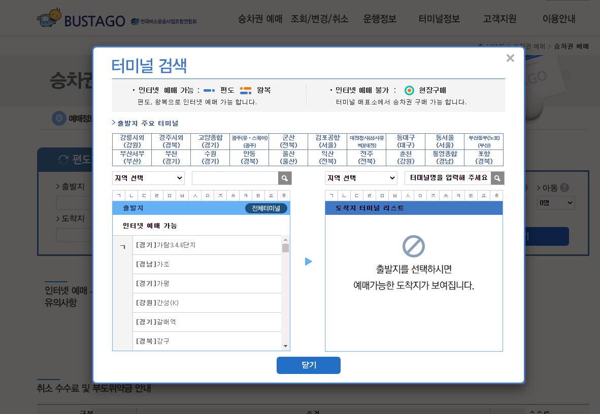 출발지 돋보기를 눌러 터미널검색창을 뛰운다